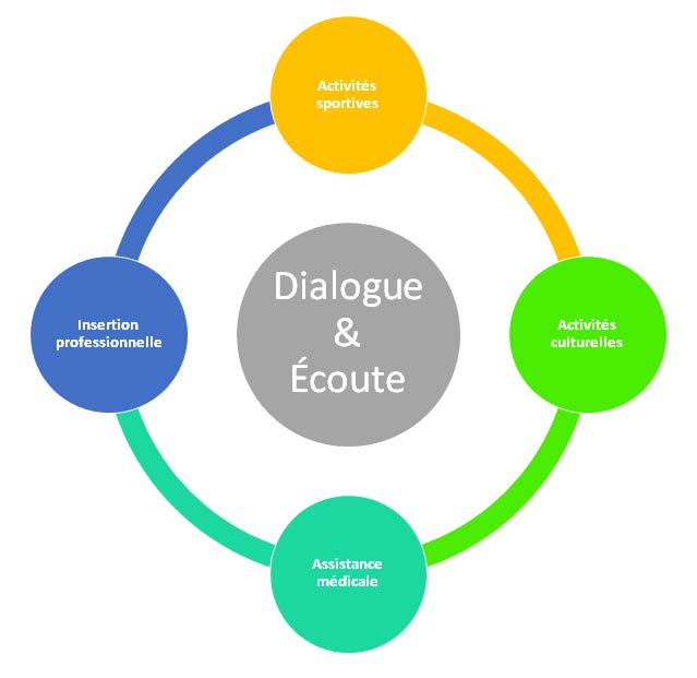 L’accompagnement des jeunes secourus dans le processus d’insertion sociale, se matérialise au travers de toutes les actions que nous menons visant à renforcer et à favoriser l’interaction entre nos jeunes et leurs environnements respectifs. L’intégration sociale passe par plusieurs phases.